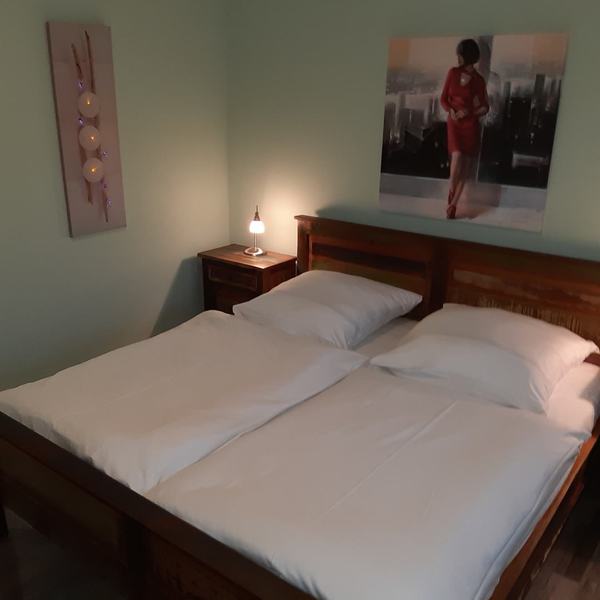 Das Schlafzimmer ist mit einem sehr bequemen Doppelbett - ebenfalls aus Indien - und einem praktischen Kleiderschrank ausgestattet.